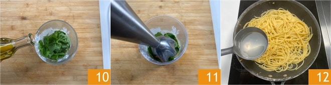 Enquanto isso, em um recipiente alto, coloque a stracciatella, o manjericão e uma colher de óleo 10. Bata tudo até obter um creme liso 11. Após 5 minutos, escorra a massa (sem descartar a água de cozimento) e transfira para a frigideira onde você havia cozinhado o salmão. Prossiga com o cozimento da massa, adicionando 1 concha de água de cozimento conforme necessário 12. Dessa forma, formará um creme delicioso.