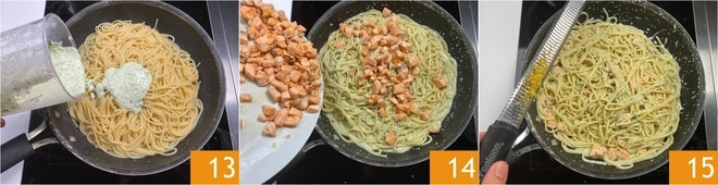 Adicione o creme de stracciatella e manjericão 13 e salteie tudo. Adicione os cubos de salmão 14 e a casca de limão 15.