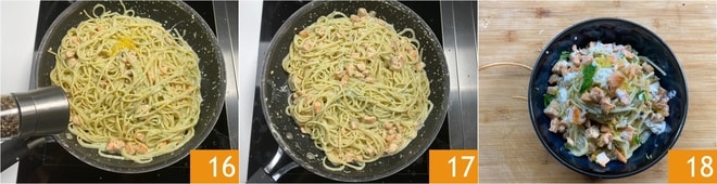 Adicione também uma pitada de pimenta preta 16 e salteie bem a massa 17 antes de servir 18.