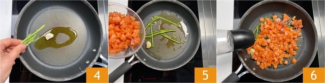 Em uma frigideira grande, aqueça um fio de óleo junto com um dente de alho e os talos de manjericão 4. Deixe ganhar sabor e adicione os cubos de salmão 5. Adicione sal e pimenta 6 e cozinhe em fogo alto por 4 minutos. Enquanto isso, rale a casca do limão e esprema o suco.
