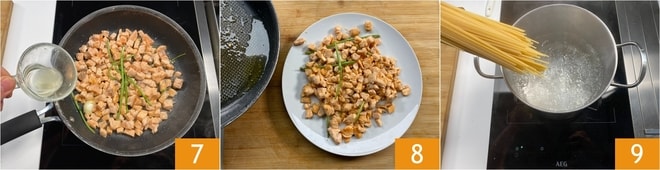 Quando estiver bem dourado, regue o salmão com o suco de limão 7 e cozinhe por mais 1-2 minutos. Transfira os cubos de salmão para um prato, escorrendo a gordura de cozimento e reservando a frigideira, que será usada posteriormente para saltear a massa, e cubra-os com um prato para não secar. Mergulhe os espaguetes na água que já terá atingido a fervura 9 e cozinhe-os pela metade do tempo de cozimento.
