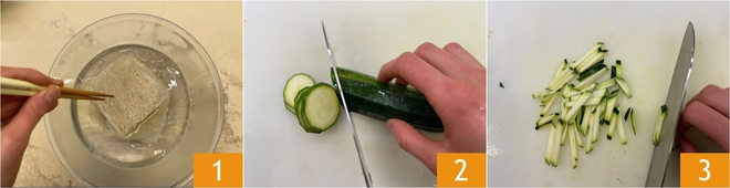 Para preparar o espaguete de arroz com legumes, prima di tutto immergete i noodles in acqua fredda o leggermente tiepida e lasciateli in ammollo per circa 25-30 minuti 1. Nel frattempo occupatevi degli altri ingredienti: tagliate le zucchine prima a fettine in obliquo 2 e poi a julienne 3.<\/p>