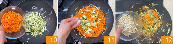 Despeje anche no wok as cenouras 10, salate 11 e pepate. Salteie tudo em fogo alto por 2-3 minutos, poi aggiungete i germogli di soia 12.<\/p>