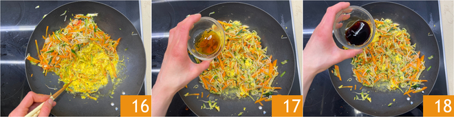Cozinhe rapidamente os ovos mexidos com os pauzinhos 16, poi amalgamatele alle verdure e deglaceie con il vino di riso 17. Lasciate evaporare completamente la parte alcolica, dopodiché versate anche la salsa di soia 18.<\/p>