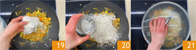 At this point scolate bene gli spaghetti di riso e uniteli in padella 19, insieme a un mestolino della loro acqua di ammollo 20. Mescolate bene, poi coprite con il coperchio e cuocete per altri 2 minuti 21.<\/p>