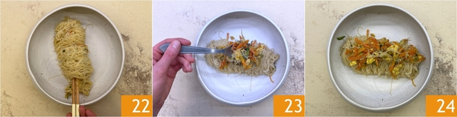 Sirva imediatamente o espaguete de arroz 22 com seu condimento 23. O espaguete de arroz com legumes está pronto para ser servido 24!<\/p>