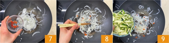 Parta per la cottura: in un wok scaldate un giro abbondante di olio di semi, poi aggiungete le cipolle e il peperoncino 7. Refogue brevemente em fogo médio, mexendo com i bacchette 8, dopodiché unite le zucchine 9.<\/p>