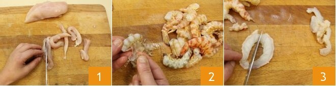 Para preparar o espaguete frito com frango e camarões, comece cortando o peito de frango em tiras 1, removendo o osso central, se houver. Limpe os camarões: retire a cabeça, o rabo e tire a casca 2, depois divida-os ao meio no sentido do comprimento 3 e retire o intestino com um palito.