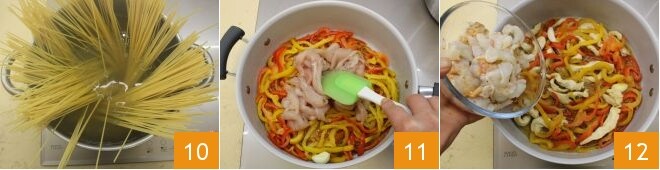 Cozinhe o espaguete em bastante água fervente, salgada a gosto 10. Enquanto isso, adicione o frango aos pimentões 11 e cozinhe por 4-5 minutos, em seguida, adicione também os camarões 12 e mais 50 g de molho de soja, continue cozinhando por mais 5 minutos.