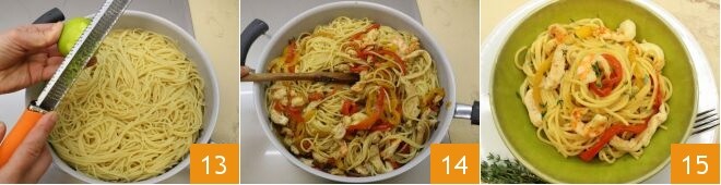 Quando o espaguete estiver cozido, escorra-o diretamente na panela com os pimentões, reservando algumas conchas da água de cozimento, aromatize com a casca ralada de um limão ou lima 13 e tomilho. Adicione uma concha da água de cozimento e refogue por alguns segundos 14. Sirva o espaguete frito com frango e camarões bem quente 15.