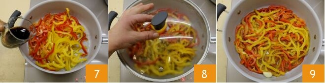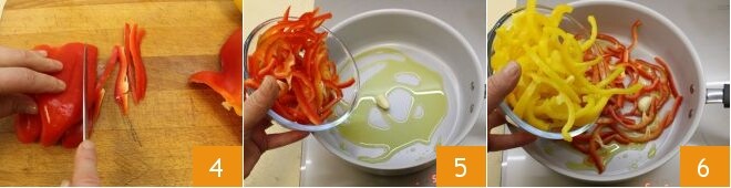 Corte os pimentões em tiras 4 depois de remover o talo, os filamentos e as sementes internas. Refogue o azeite com o dente de alho na panela, depois adicione os pimentões (5-6)