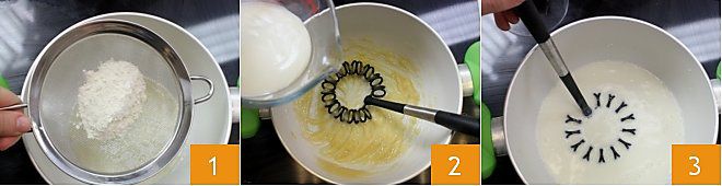 Para preparar os espetinhos à bolonhesa, comece pelo molho bechamel. Para o procedimento, você também pode consultar a ficha do molho bechamel. Em uma panela grande, derreta a manteiga em fogo baixo, depois adicione a farinha peneirada 1. Misture com um batedor de espiral ou um batedor comum para evitar que se formem grumos e aos poucos adicione o leite em fio 2. Misture até que o bechamel atinja a consistência de um creme aveludado 3. Em seguida, adicione sal, pimenta a gosto e uma pitada de noz-moscada ralada. Agora que o bechamel está pronto, transfira-o para uma tigela e deixe esfriar. Se você preparar o bechamel para os espetinhos com muita antecedência, é aconselhável colocá-lo em uma tigela coberta com filme plástico para que não resseque muito. Se engrossar demais, pode-se diluir com leite frio, misturando com um batedor.