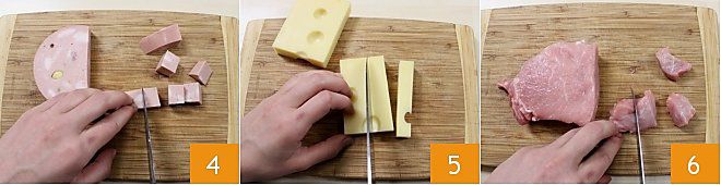Agora proceda para preparar os espetinhos: corte em cubinhos de cerca de um centímetro e meio de lado, a mortadela, o queijo emmental e o lombo que você usará alternando para preparar os espetinhos (4-5-6).