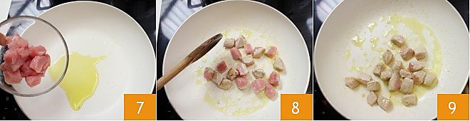 Em uma frigideira, coloque um fio de azeite de oliva e salteie os cubinhos de lombo por poucos minutos 7, virando-os frequentemente para dourar todos os lados (8-9). Retire do fogo e deixe esfriar antes de começar a formar os espetinhos.