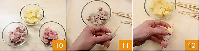 Agora que você tem todos os ingredientes prontos 10, pegue 18 espetinhos e comece a espetar em cada um um cubinho de mortadela, um cubinho de lombo 11 e um de queijo 12, unindo-os bem para que fiquem próximos. Você pode optar por colocar o cubinho de queijo no meio para reduzir o risco de derreter durante a cocção.