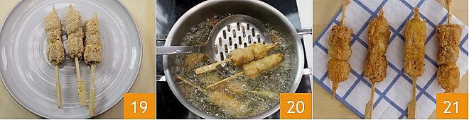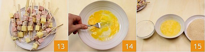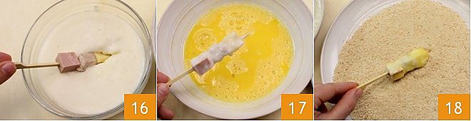 Na ordem, mergulhe cada espetinho primeiro no molho bechamel que você deixou de lado 16, depois no ovo 17 e finalmente passe na farinha de rosca 18.