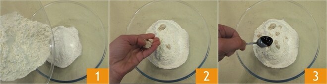 Para preparar a pita, misture a farinha manitoba e a farinha 00 em uma tigela 1, depois adicione o fermento fresco esfarelado 2 e o malte 3.
