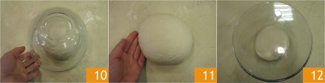 Quando o óleo for completamente absorvido, cubra a massa com a tigela e deixe descansar por 10 minutos 10. Após esse tempo, faça algumas dobras para reforçar a massa, depois forme uma bola 11 e transfira para a tigela, que você untou com um pouco de óleo. Cubra com filme plástico e deixe crescer em temperatura ambiente por cerca de 2 horas ou até que a massa triplique de volume 12.