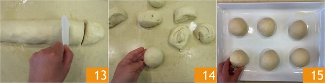 Depois de crescida, transfira a massa para a bancada levemente enfarinhada, forme um pão e divida-o em 6 porções de 140 g cada 13. Modele cada porção de massa para formar uma bolinha 14 e coloque-as bem espaçadas em uma bandeja untada com um pouco de óleo 15. Cubra com filme plástico e deixe crescer por mais uma hora.