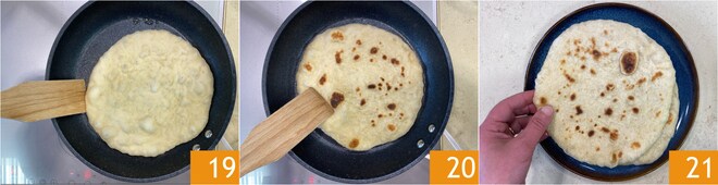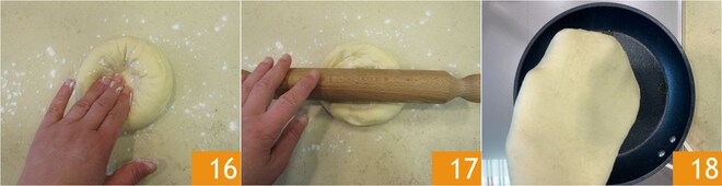 Após esse tempo, estenda as bolinhas na bancada levemente enfarinhada para obter discos com diâmetro de cerca de 20 cm; use primeiro as mãos 16 e depois o rolo, para uniformizar a espessura 17. Você está pronto para cozinhar: aqueça bem uma frigideira antiaderente com um fio de óleo, depois coloque a pita dentro 18.