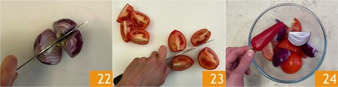 Para preparar os espetos de frango, comece pela marinada: descasque e corte a cebola em 4 partes 22, depois faça o mesmo com os tomates 23. Transfira cebolas e tomates para uma tigela junto com a pimenta inteira 24.