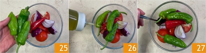 Adicione também os pimentões inteiros 25 e um fio de óleo 26, depois misture bem para temperar uniformemente os vegetais 27.