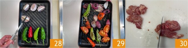 Coloque os vegetais em uma grelha bem quente 28 e deixe-os tostar, virando-os de vez em quando com pinças de cozinha 29. Enquanto isso, corte as sobrecoxas de frango em pedaços e reserve 30.