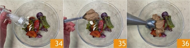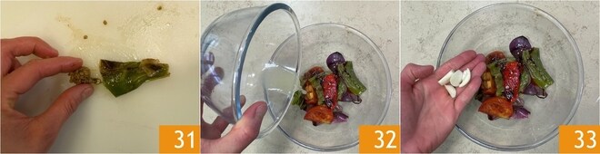 Quando os vegetais estiverem tostados, pegue os pimentões e elimine a extremidade e as sementes internas 31, depois faça o mesmo com a pimenta. Transfira novamente os vegetais para a tigela e adicione o suco de limão 32, depois junte o dente de alho descascado 33.