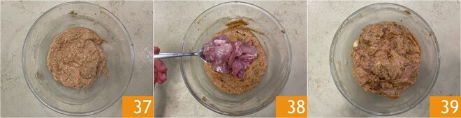 Você obterá uma mistura de consistência bastante grossa 37. Nesse ponto, coloque o frango na tigela 38 e misture bem para que os pedaços fiquem uniformemente cobertos. Cubra com filme plástico e deixe marinar na geladeira por pelo menos uma hora ou, melhor ainda, durante toda a noite 39.