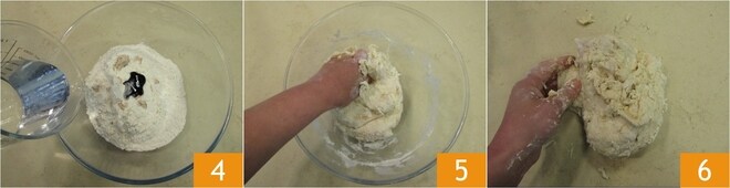 Adicione também a água 4 e comece a amassar, primeiro na tigela 5 e depois na bancada 6.