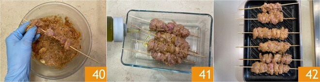 Após o tempo de marinada, você pode montar os espetos: espete os pedaços de frango em 6 espetos de madeira, que você deixou de molho por cerca de dez minutos (assim eles não queimam). Separe ligeiramente os pedaços para garantir um cozimento uniforme 40. Depois de montados, tempere os espetos com um fio de óleo 41, depois coloque-os em uma grelha bem quente 42.