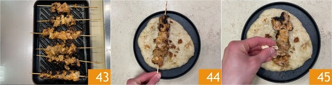 Cozinhe os espetos por 10-15 minutos, virando-os frequentemente 43. Você está pronto para montar o sanduíche: coloque a pita em um prato e coloque um espeto no centro 44, depois retire a carne do espeto e adicione algumas nozes torradas 45.