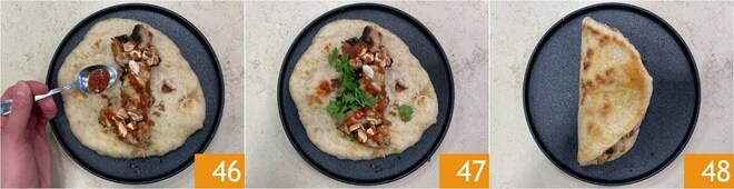 Tempere com molho picante a gosto 46, uma pitada de limão, algumas rodelas de pimenta e coentro fresco, depois dobre ao meio 48. Proceda desta forma para montar as pitas restantes. Seus espetos de frango com pita estão prontos para serem saboreados!