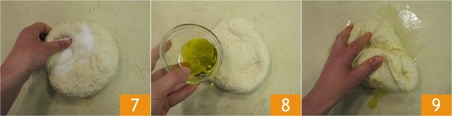 Abra ligeiramente a massa obtida e adicione o sal 7, depois trabalhe novamente até não sentir mais os grãos sob os dedos. Depois de incorporar o sal, faça o mesmo com o óleo, adicionando-o em 2-3 vezes 8 9.