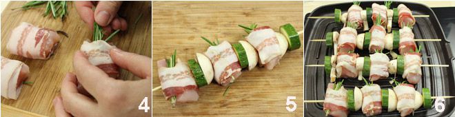 Corte o peito de frango em cubos de 3 cm de lado e obtenha 24 cubos 1. Lave as abobrinhas, elimine as extremidades e corte-as em fatias de 1 cm de espessura, obtendo 24 rodelas. Lave e corte os cogumelos em fatias de 1 cm de espessura 2, obtendo 24 fatias. Pique o alecrim e obtenha 24 raminhos. Envolva cada cubo de frango em uma fatia de bacon 3,