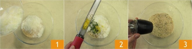 Para preparar os espetinhos de scamorza no churrasco, primeiro lave todos os vegetais, os limões e as folhas. Depois seque bem. Agora prepare a crosta. Triture grosseiramente o pão e transfira-o para uma tigela. Adicione o Grana ralado, as agulhas de alecrim e a raspa de 2 limões 2. Adicione uma pitada de sal e uma pitada de pimenta 3.