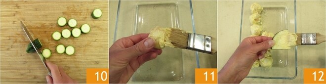 Passe para a abobrinha, corte as pontas e corte-a em rodelas grossas 10. Deixe os tomatinhos inteiros. Agora pegue as scamorzinhas e pincele-as com maionese 11. Faça o mesmo com todos os vegetais 12, exceto os tomatinhos, e coloque-os em uma assadeira.
