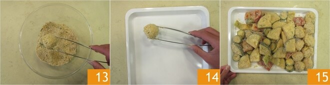 Passe então as scamorzinhas na crosta 13 e transfira-as para outra bandeja 14, depois faça o mesmo com todos os outros vegetais 15.