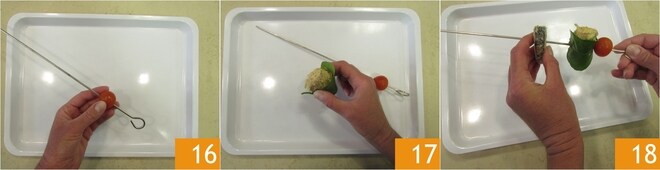 Monte agora os espetinhos. Primeiro espete um tomatinho 16, depois envolva uma das scamorzinhas em uma folha de limão 17, antes de espetá-la com o espeto. Adicione agora uma abobrinha 18, um pimentão e um pedaço de berinjela.