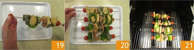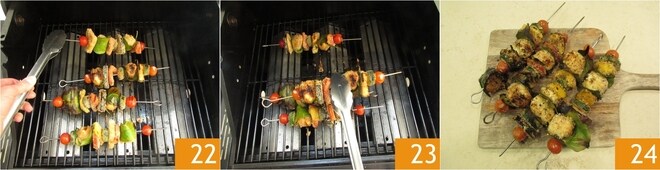 Feche a tampa do churrasco e cozinhe por cerca de 5 minutos. Quando estiverem bem tostados, vire-os 22 e continue o cozimento brevemente do outro lado. Use uma pinça para remover os espetinhos do churrasco 23 e transfira-os para uma tábua de corte 24. Adicione mais um pouco de raspa de limão e sirva-os bem quentes, acompanhados com maionese e um esguicho de limão a gosto.