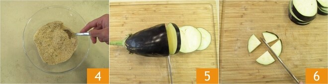 Misture bem 4 e reserve. Agora cuide dos vegetais. Comece pelas berinjelas, corte-as primeiro em fatias de 1 cm de espessura 5 e depois em pedaços 6.