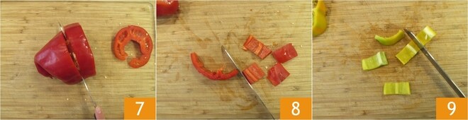 Agora passe para o pimentão vermelho, corte-o em fatias grossas 7, retire as sementes internas e depois corte-o em pedaços 8. Faça o mesmo com o pimentão amarelo 9.