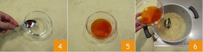 Coloque em um recipiente um pouco de água quente (se preferir, pode ser um caldo de legumes) e adicione o açafrão 4, dissolva bem 5 e depois coloque na panela com o arroz 6