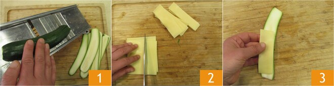 Para preparar os espirais de abobrinha recheada, primeiro lave as abobrinhas, corte as extremidades e, com um cortador, faça fatias longitudinais de aproximadamente 4-5 mm de espessura 1. Você vai precisar de 36 fatias de abobrinha. Corte o queijo em fatias da mesma largura das abobrinhas 2. Agora pegue uma fatia de abobrinha, coloque 2 fatias de queijo por cima 3.