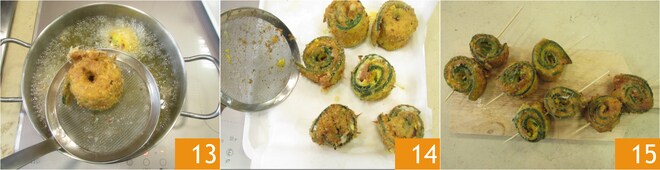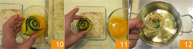Coloque o óleo para aquecer para fritura. Enquanto isso, bata os ovos com um pouco de sal e pimenta. Passe os espirais primeiro no ovo 10 e depois na farinha de rosca 11. Frite 2-3 espirais por vez no óleo a uma temperatura de 170°C por aproximadamente 4-5 minutos 12.