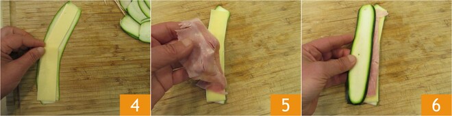Você deve cobrir toda a superfície 4. Recheie com uma fatia de presunto 5 e sobreponha outra fatia de abobrinha 6.