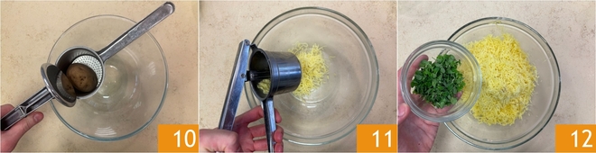 Escorra as batatas cozidas, amasse-as ainda quentes com o espremedor de batatas 10 e coloque o purê em uma tigela 11. Tempere com as folhas de manjerona fresca 12.