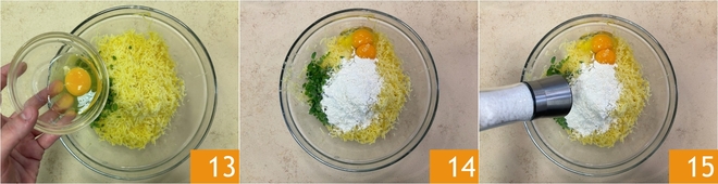Adicione o ovo inteiro 13 e a gema, depois acrescente a farinha 14 e salgue 15.