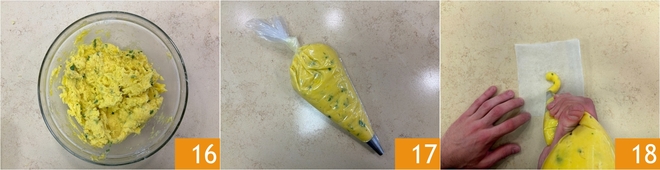 Misture a massa até que esteja homogênea 16, então transfira para um saco de confeitar com bico de 12 ou 13 mm 17. Corte quadrados de 10x10 cm de papel manteiga e esprema a massa começando pelo centro 18.
