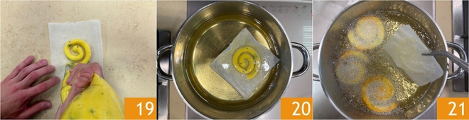 Você deve formar espirais 19. Aqueça o óleo de semente de girassol em uma panela e, quando atingir 180°, mergulhe os quadrados de papel manteiga com as espirais 20, depois remova o papel com uma pinça 21. Frite poucos pedaços de cada vez para evitar que a temperatura do óleo caia.